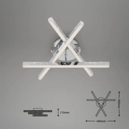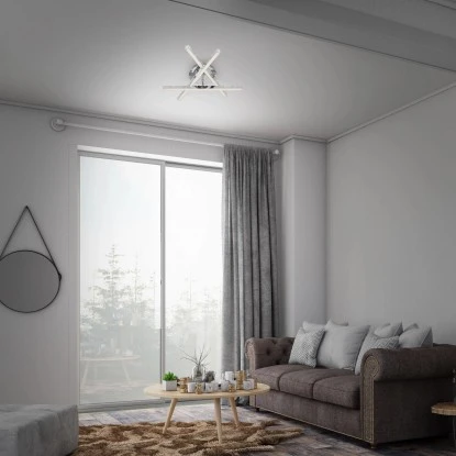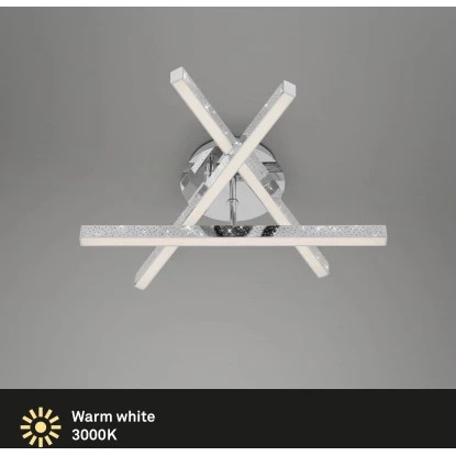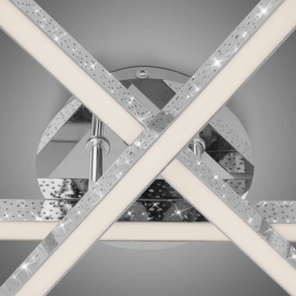 Die 3-flammige Brilo LED-Deckenleuchte der Serie Rey ist aus Metall und Kunststoff gefertigt und wird mit ihrem Glitzereffekt durch Laserlochoptik zum Eyecatcher in jeder Räumlichkeit. Die zwei LED-Stäbe verteilen das Licht gleichmäßig. Durch ihre blendfreien Eigenschaften kommt die Deckenleuchte insbesondere in Schlaf-, Kinder-, Wohn- und Esszimmer zum Einsatz. Die Deckenleuchte ist mit langlebigen, energieeffizienten und festverbauten LED-Platinen ausgestattet, die einen Energieverbrauch von je 6 Watt vorweisen. Die LED-Stäbe der Deckenleuchte haben eine Lichtleistung von 2.200 Lumen, die zusammen mit der Farbtemperatur von 3.000 Kelvin eine angenehm warmweiße Beleuchtung kreieren.