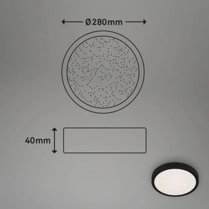 Die LED-Deckenleuchte Runa, gefertigt aus Kunststoff mit schwarzem Metallrahmen inklusive einem Sternencover (viele kleine Lichtpunkte, die zusätzlich zum Vorschein kommen) ist ein echter Hingucker für jedes Zimmer. Die Leuchte kommt inklusive einer LED-Platine mit 18 Watt und einer Lichtleistung 2.000 Lumen. Mit einer neutralweißen Lichttemperatur von 4.000 Kelvin sorgt sie für ein angenehmes Lichtverhältnis. Die Leuchte besitzt außerdem eine lange Lebensdauer von 25.000 Stunden. Die Maße der Deckenleuchte betragen 280x40mm (DxH).
