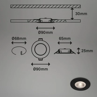 Die Brilo LED-Einbauleuchte Kulana Dimmbar 4 Stk. Schwarz matt 4,9 W hat eine fest verbaute LED-Platine mit 4,9 Watt und einer Lichtleistung von 480 Lumen. Die Leuchte hat eine warmweiße Lichtfarbe und kann über einen herkömmlichen Wandschalter in Stufen gedimmt werden. Sie ist mit der Schutzart IP44 vor Spritzwasser geschützt und somit auch für den Badbereich geeignet. Die Einbauleuchte kommt im praktischen Viererset. Das Einbaumaß hat einen Durchmesser von 68 mm und die Einbauhöhe beträgt 30 mm.