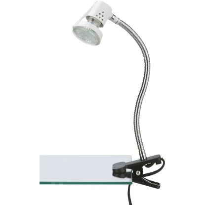Mit dieser praktischen LED-Klemmleuchte setzen Sie gezielt moderne Akzente in Ihrem Zuhause. Die Leuchte überzeugt durch innovative LED-Technologie und einen individuell verstellbaren Flexarm. Zudem ist die Leuchte mit einem praktischen An-/Aus-Schalter und einer schwarzen Zuleitung ausgestattet. Die Leuchte wird inklusive einem LED-Leuchtmittel GU10 3 Watt geliefert. Die LEDs haben eine lange Lebensdauer von 25.000 Stunden und strahlen in Warmweiß mit einer Farbtemperatur von 3.000 K.