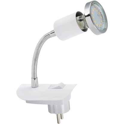 Mit dieser praktischen LED-Steckerleuchte setzen Sie gezielt moderne Akzente in Ihrem Zuhause. Die Leuchte überzeugt durch eine Kombination aus Metall sowie einem dreh- und schwenkbaren Leuchtkopf. Zudem ist die Leuchte mit einem Schalter ausgestattet. Im Lieferumfang ist ein LED GU10 3 Watt Leuchtmittel enthalten. Die LEDs haben eine lange Lebensdauer von 25.000 Stunden und strahlen in Warmweiß mit einer Farbtemperatur von 3.000 K.