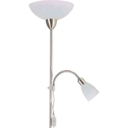 Der Deckenfluter Pienza sorgt mit seinem stabilen Fuß für eine gute Standfestigkeit auf ebenen Flächen. Die flexible Leseleuchte lädt zum Verweilen mit einem guten Buch ein. Die nickelfarbene Stehleuchte mit Glas hat eine Höhe von ca. 180 cm und das Deckenglas hat einen Durchmesser von ca. 30 cm. Der Deckenfluter ist für Leuchtmittel 1 x E27 mit max. 100 W und 1 x E14 mit max. 40 W geeignet.