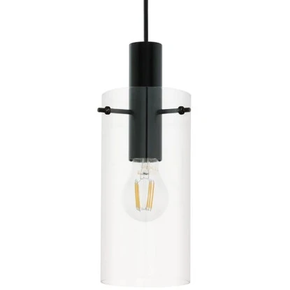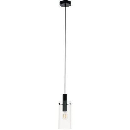 Diese Hängeleuchte der Serie Montefino ist aus schwarzem Stahl sowie klarem Glas gefertigt.