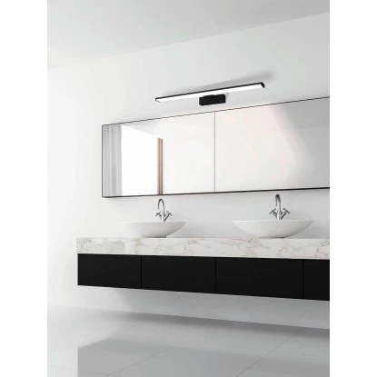 Die LED Spiegelleuchte Pandella 1 ist spritzwassergeschützt (IP44) und ermöglicht einen bedenkenlosen Einsatz im Badezimmer. Sie ist aus schwarzem Aluminium und Kunststoff gefertigt. Die festverbauten LEDs spenden helles neutralweißes Licht und sind dank der weißen Kunststoff-Abdeckung nicht sichtbar. Die Wandleuchte fügt sich nahtlos in moderne Einrichtungen ein und bietet eine stilvolle Beleuchtung im Bad über dem Spiegel.