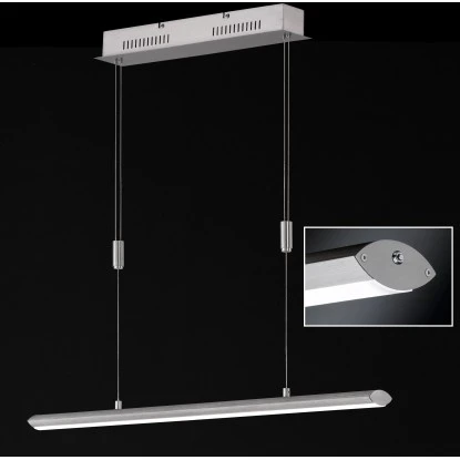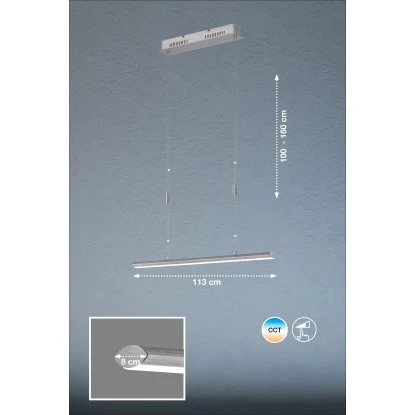Durch die moderne Oberfläche in aluminium-nickelfarben matt findet dieses Modell automatisch einen besonderen Platz in jedem Wohn- Essbereich. Mit einer Länge von 113 cm und einer Breite von 8 cm leuchtet sie jeden Tisch optimal aus und lässt durch die Höhenverstellbarkeit von 100-160 cm auch in diesem Bereich keine Wünsche offen.
