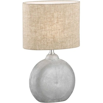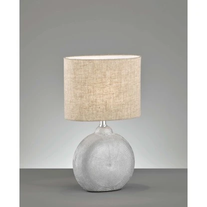 Diese Fischer & Honsel Tischleuchte Foro wirkt mit Ihrem ausgefallenen Leuchtenfuß wie ein antikes Meisterstück. Ein Eyecatcher in jeder modernen Wohnlandschaft. Die Lampe ist mit einer E14-Fassung für Leuchtmittel mit 40 Watt ausgelegt. Durch den Lampenschirm aus sandfarbenem Stoff scheint das Licht indirekt in den Raum. Diese moderne Tischbeleuchtung ist die perfekte Alternative zum hellen Deckenlicht am Abend. Diese Tischlampe wird klassisch über einen Schnurschalter ein- und ausgeschaltet. Die Tischleuchte ist aus Keramik in Silberfarben. Maße (LxBxH): 23 cm x 13 cm x 36 cm. Lieferung exkl. Leuchtmittel.