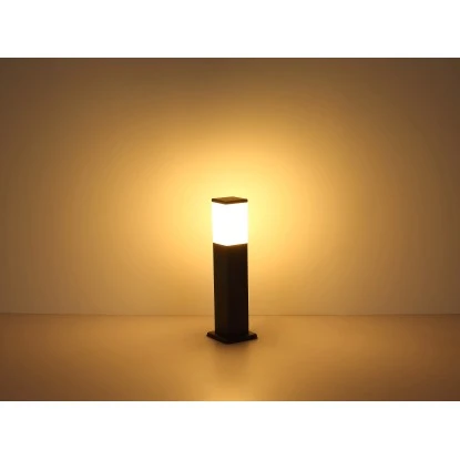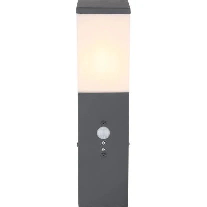 Die Globo Außenlampe Herri überzeugt durch Ihr stilvolles Design aus anthrazitfarbenem Edelstahl. Die 33 cm große Außenleuchte besteht aus einem Edelstahlquader, der mit opalen Kunststoff versehen ist. der bedeckt die E27-Fassung der Leuchte, welche Sie mit einem passenden LED-Leuchtmittel bestücken können. Dadurch haben Sie die Möglichkeit, Lichtfarbe und Helligkeit nach Ihren Vorstellungen zu bestimmen. Ein weiteres Highlight der Leuchte ist der integrierte Sensor, der im Bereich von max. 7 m und 90° reagiert. Mit der Leuchte können Sie Ihre Außenbereiche stilvoll ergänzen.