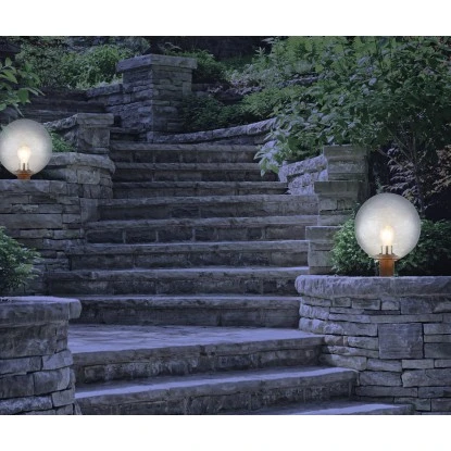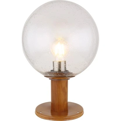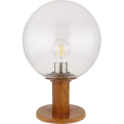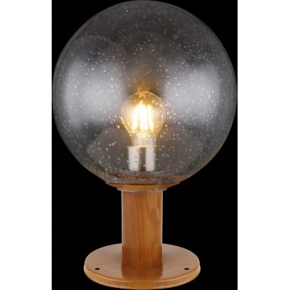 Diese zeitlose Außenleuchte (Ø25 cm) der Serie Ossy ist ideal mit einer Höhe von 38 cm als Stehleuchte im Außenbereich geeignet und macht durch ihre schöne Holzoptik ein tolles Gesamtbild. Aus einem zylinderförmigen Körper in schöner Holzoptik ragt eine E27 LED Fassung welche mit einem Leuchtmittel Ihrer Wahl, bis zu einer maximalen Leistung von 15 Watt, bestückt werden kann. Ein kugelförmiger Glasschirm mit Blasen überdeckt die E27 LED Fassung und sorgt für einen Schutz gegen Wasserspritzer.