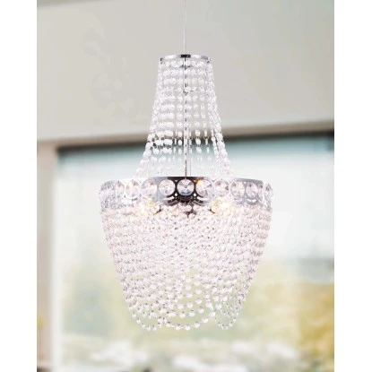 Dieser schöne Lüster aus Chrom, der Serie Stromboli, zeichnet sich durch sein auffälliges Design, sowie durch seine hochwertige Verarbeitung aus. Bei dieser Hängelampe wurden klare Acrylkristalle gewählt. Mit einem Durchmesser von 38 cm ist diese imposante Hängelampe der Hingucker in jedem Raum. Ausgestattet mit drei E14 Fassungen, wird Ihnen die Möglichkeit geboten beliebige Leuchtmittel (max. 60W) einzusetzen. Wir empfehlen Ihnen LED-Leuchtmittel aufgrund ihrer Langlebigkeit und Stromersparnis.