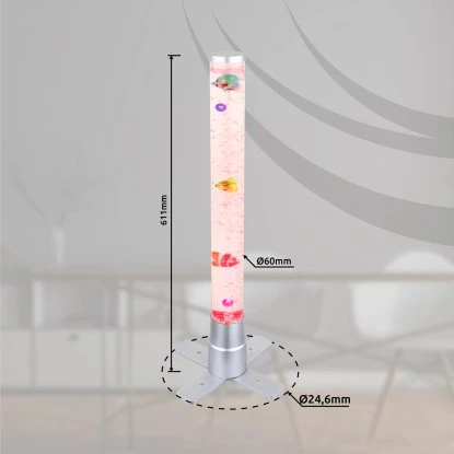 Diese tolle Stehleuchte der Serie Mendoza begeistert durch Ihr einzigartiges Design. Aus einem Standbein ragt ein zylinderförmiges Gefäß mit einer Höhe von 61 cm inklusive Dekorationsfische welche durch aufsteigende Luftblasen sich auf und ab bewegen. Durch ein RGB LED Leuchtmittel im Standfuß scheint das Wasser in unterschiedlichen Farben und sorgt für einen tollen Effekt.