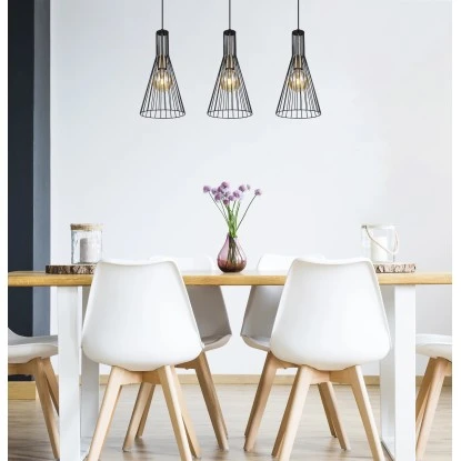 Diese tolle Pendelleuchte begeistert durch Ihr schlichtes Design. Drei E27 Fassungen hängen an jeweils einem schwarzen Kabel 1,2m an einer schmalen (84×20 cm) Deckenbefestigung von der Decke. Die E27 Fassungen sind mit einem schönen Schirm aus Metallstäben bestückt und ermöglichen Ihnen selbst, bis zu einer maximalen Leistung von 40 Watt, über Lichtfarbe und Helligkeit zu bestimmen.