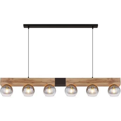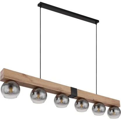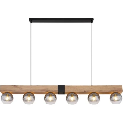 Diese schöne Deckenleuchte der Serie MOITAS begeistert durch tolles Design. Aus einer rechteckig schwarzen Deckenbefestigung ragen zwei schwarze Kabel mit einer Länge von 1,2m zu einem Block in Holzoptik (140×15 cm). An dem befinden sich sechs E27 Fassungen mit jeweils einem Glasschirm in Rauchfarben. Die E27 Fassungen ermöglichen Ihnen, bis zu einer maximalen Leistung von 40 Watt, selbst über Lichtfarbe und Stärke zu entscheiden.