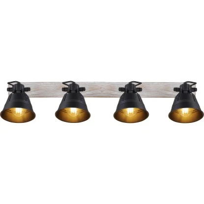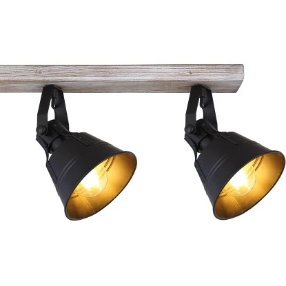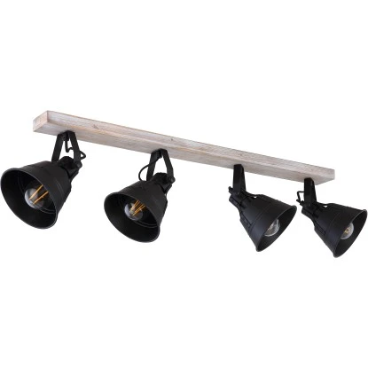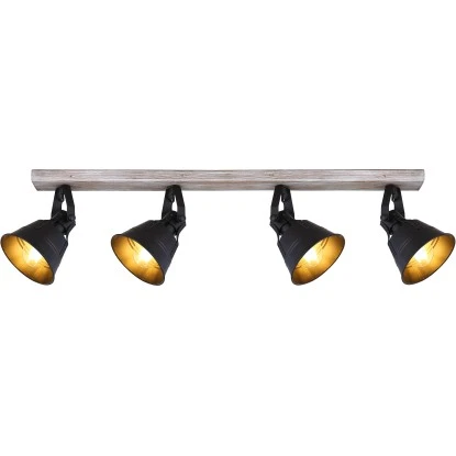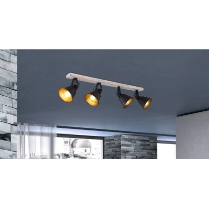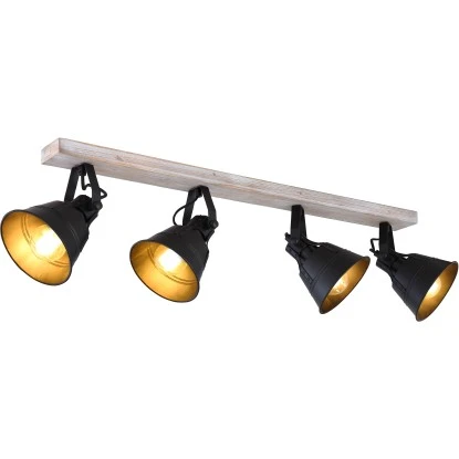 Der Deckenstrahler Günther zeichnet sich durch sein angesagtes Vintage-Design aus. Die vier metallischen schwenkbaren Schirme sind an einem länglichen Arm aus Holzoptik befestigt. Diese bestehen aus schwarzem Metall. Die goldenen Innenschirme sorgen für das richtige Licht unabhängig davon, für welches Leuchtmittel Sie sich entscheiden (4 x E27 / max.: 60 W). Mit weiteren Modellen dieser Serie können Sie das Bild in Ihrem Bereich komplettieren.