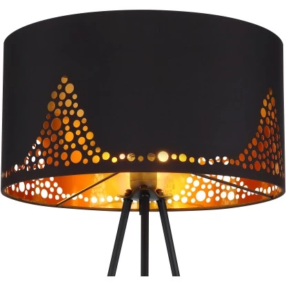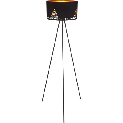 Diese Stehlampe aus der Ingeborg-Serie (Ø 60,5 cm) ergänzt Ihre Innenräume um eine elegante Lichtquelle. Die 150 cm große Stehleuchte besteht aus einem außen schwarz und innen golden getönten Textilschirm mit runden Stanzungen, welcher auf drei mattschwarzen Metallstäben fixiert ist und mit einem E27-Leuchtmittel Ihrer Wahl bestückt werden kann. Dadurch haben Sie die Möglichkeit, Lichtfarbe und Helligkeit individuell zu bestimmen. Mit dem inkludierten Schalter können Sie sie zudem bequem ein- und ausschalten Durch weitere Artikel dieser Serie können Sie in Ihren vier Wänden für ein stilvolles Ambiente sorgen.