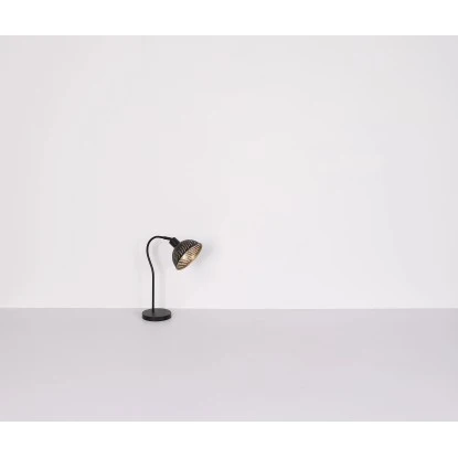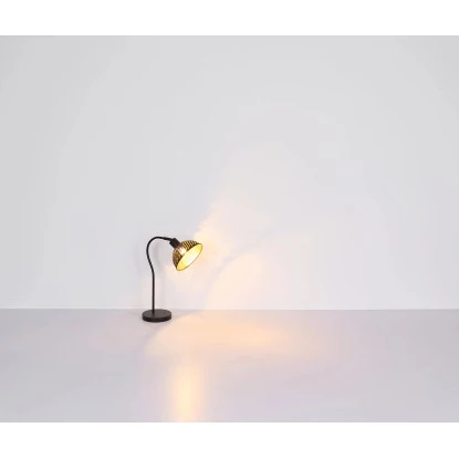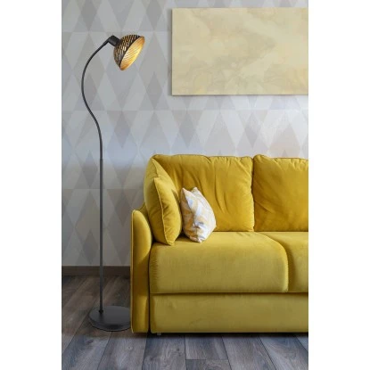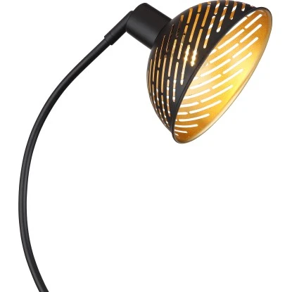 Diese moderne Stehleuchte begeistert durch Ihr schönes Muster. Aus einem schwarzen runden Sockel ragt eine schwarz matt geschwungene Stange welche in ca. 1,5m Höhe an einer E27 Fassung mündet. Ein schwarz goldener Metallschirm aus schönen Dekorstanzungen befindet sich auf der E27 Fassung, welche Ihnen auch die freie Auswahl, bis zu einer maximalen Leistung von 40 Watt, über Ihr Leuchtmittel gibt.