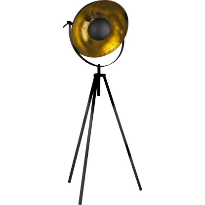 Diese außergewöhnliche schwarze dreibeinige Stehlampe Lenn besticht durch ihre auffällige, originelle Optik. Der Schirm ist schwenkbar und innen Goldfarben. Außerdem ist diese Lampe höhenverstellbar, wird durch einen On-Off-Schalter bedient und verfügt über eine E27 Fassung, für die ein Leuchtmittel bis zu 60 Watt frei ausgewählt werden kann. Mit weiteren Steh-, Wand- und Deckenlampen dieser Serie können Sie Ihr Bild komplettieren.