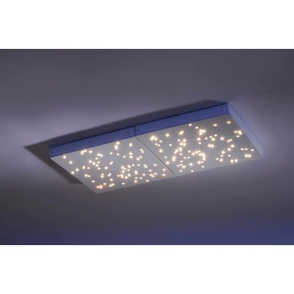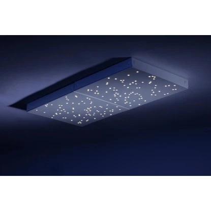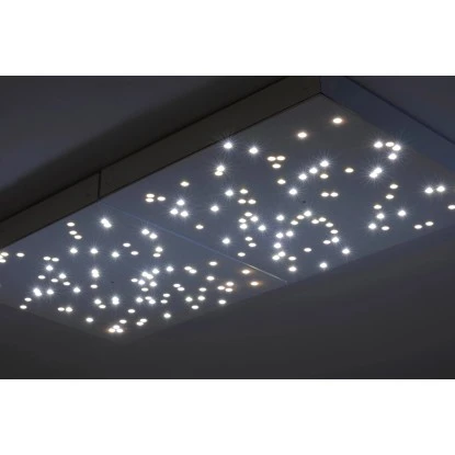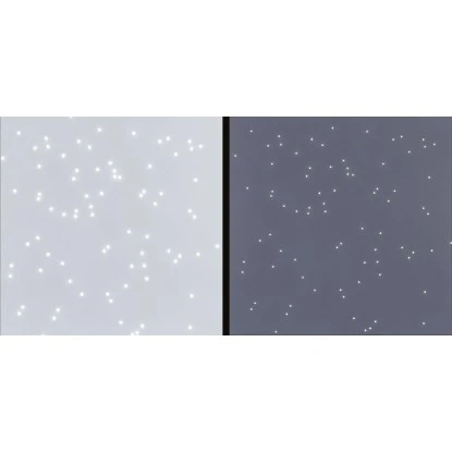 Mit dem Master-LED-Paneel Universe lässt sich die Illusion eines perfekten Sternenhimmels an die Wohnraumdecke zaubern. Das Paneel wird mit einer Funkfernbedienung geliefert. Mittels Fernbedienung werden die unterschiedlichen Einstellungen über das Master-Paneel angesteuert. Man kann zwischen zwei verschiedenen Modi wählen. Im Modus 1 strahlt das Paneel hell mit 700 Lumen und einer warmweißen Farbtemperatur von 3.000 Kelvin. Im Modus 2 glimmt das Paneel nur ganz leicht und erzeugt ein perfektes Abbild des nächtlichen Sternenhimmels bei 70 Lumen und einer Farbtemperatur von 4.000 Kelvin. Sie können beliebig viele Universe-Elemente zu einer Fläche zusammenfügen und so ein Wand- oder Deckenbild nach Ihren Vorstellungen gestalten. Das Master Paneel ist mit einem Kabel von 50 cm zum Verbinden mit anderen Leuchten ausgestattet. Die Länge und Breite des Paneels beträgt 30 cm und es hat eine Abhängung von 3 cm.