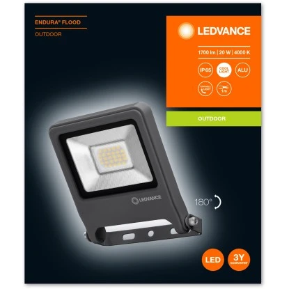 Die Ledvance LED-Außenleuchte Endura Flood 20 W 4000 K Dunkelgrau ist eine sehr helle und funktionelle LED-Außenleuchte. Sie produziert einen symmetrischen Ausstrahlungswinkel von 110 ° x 110 °. Außerdem besitzt sie einen Montagebügel mit Rotationsbereich von bis zu 180 °. Sie ist dank der Schutzart IP65 für den Außenbereich geeignet und hält Umgebungstemperaturen bei Betrieb von -20 bis +45 °C aus. Für die Installation ist der Anschluss über ein Kabel (1 m) und eine Verdrahtung erforderlich.