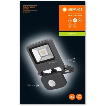 Die Ledvance LED-Außenleuchte Endura Flood mit Sensor 10 W 4000 K Dunkelgrau ist eine sehr helle und funktionelle LED-Außenleuchte. Sie produziert einen symmetrischen Ausstrahlungswinkel von 110 ° x 110 °. Außerdem besitzt sie einen Montagebügel mit Rotationsbereich von bis zu 180 °. Sie ist dank der Schutzart IP44 für den Außenbereich geeignet und hält Umgebungstemperaturen bei Betrieb von: -10 bis +40 °C aus. Für die Installation ist der Anschluss über ein Kabel (1 m) und eine Verdrahtung erforderlich. Die Lampe besitzt einen einstellbaren IR-Tageslicht- und Bewegungssensor mit einer Reichweite von bis zu 9 m.