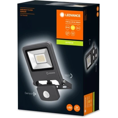 Die Ledvance LED-Außenleuchte Endura Flood mit Sensor 20 W 3000 K Dunkelgrau ist eine sehr helle und funktionelle LED-Außenleuchte. Sie produziert einen symmetrischen Ausstrahlungswinkel von 110 ° x 110 °. Außerdem besitzt sie einen Montagebügel mit Rotationsbereich von bis zu 180 °. Sie ist dank der Schutzart IP44 für den Außenbereich geeignet und hält Umgebungstemperaturen bei Betrieb von: -10 bis +40 °C aus. Für die Installation ist der Anschluss über ein Kabel (1 m) und eine Verdrahtung erforderlich. Die Lampe besitzt einen einstellbaren IR-Tageslicht- und Bewegungssensor mit einer Reichweite von bis zu 9 m.