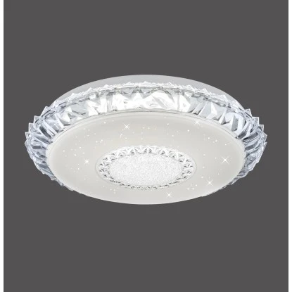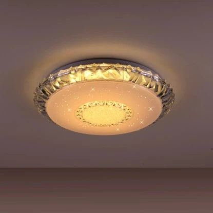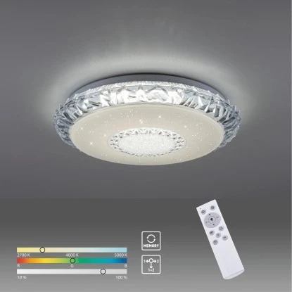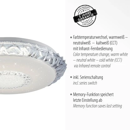 Mit der runden LED-Deckenleuchte Lucca schafft man ein wohlige Atmosphäre durch die Sternenhimmel Optik. Die LED Deckenlampe wird inklusive einem LED Leuchtmittel geliefert. Durch das integrierte CCT-Lichtmanagement lässt sich die Leuchte in der Lichtfarbe von warmweiß (2.700 Kelvin) bis zu tageslichtweiß (5.000 Kelvin) verändern. Durch diese Farbsteuerung kann man das Licht dem Tagesverlauf individuell anpassen und so die Förderung der Produktivität sowie der Konzentration steigern. Zusätzlich besteht die Möglichkeit die Leuchte in einer Farbe aus dem RGB-Farbmodus zu wählen. Per mitgelieferte Infrarot Fernbedienung kann man nicht die Lichtfarbe sondern auch die Lichtintensität nach Belieben verstellen. Alle vorgenommenen Einstellungen bleiben solange erhalten bis man eine erneute Einstellung vornimmt. Durch den hübschen kristallähnlichen Rand gibt die Leuchte ein verspieltes Lichtspiel wieder. Die Deckenlampe wird sehr schnell einen geeigneten Platz in Ihren vier Wänden finden. Sie hat einen Durchmesser von 40,0 cm und eine Abhängung von 9 cm.