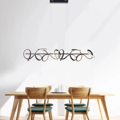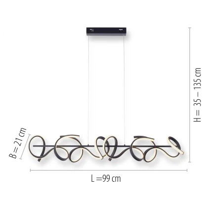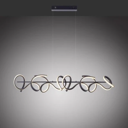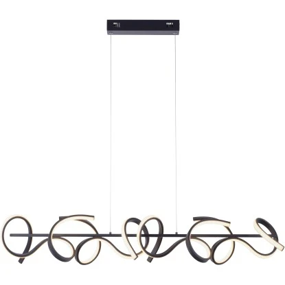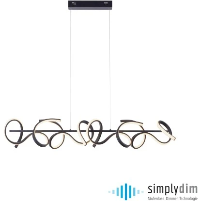 Die schwarze LED-Pendelleuchte Curls von Leuchten Direkt punktet mit einem geschwungenen Design. Die aus Stahl gefertigte LED-Pendellampe wirkt mit einer Farbtemperatur von 3000 Kelvin angenehm warmweiß. Die Pendelleuchte ist mit der neuen stufenlosen Dimmer-Technologie simply dim ausgestattet. Simply dim macht es möglich, dass man die Leuchte über einen vorhandenen Lichtschalter, ganz egal ob Kipp-, Zug-, Schnur- oder Wandschalter, dimmen kann. Die Dimmer-Technologie steuert die Helligkeit über den Schaltimpuls und so kann die Leuchte von 100% bis runter auf 10% der Lichtintensität stufenlos gedimmt werden.