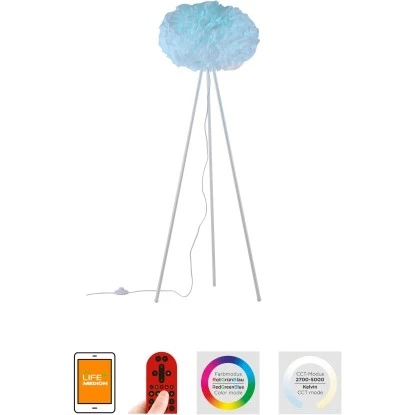 Mit der passenden App (MEDION LIFE+ oder TUYA) können alle Funktionen auch per Tablet oder Smartphone bedient werden oder man hat einen Sprachassistenten z.B. Amazon Alexa oder Google Home über den man die Einstellungen kinderleicht per Sprachbefehl verändert. Der Bezug der Lampe ist bei 30° waschbar und trocknergeeignet.