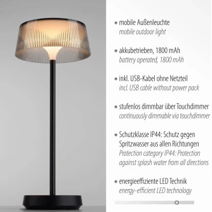 Die Tischleuchte besitzt die Schutzklasse IP44, was bedeutet, dass sie vor Spritzwasser aus allen Richtungen geschützt ist. Dadurch können Sie die Leuchte bedenkenlos im Freien verwenden, auch wenn das Wetter mal etwas feuchter sein sollte. Mit ihrer eleganten schwarzen Farbe, der praktischen Akkufunktion und der dimmbaren Beleuchtung ist die Tischleuchte Dora ein echter Blickfang für Ihren Außenbereich.