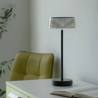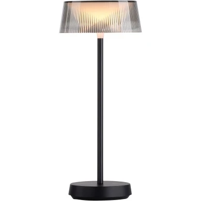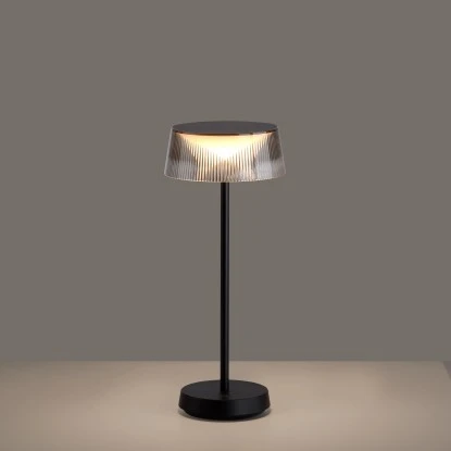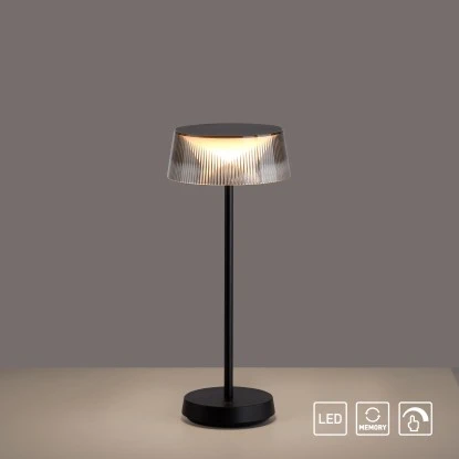 Die Leuchten Direkt Tischleuchte Dora 19711-16 in Schwarz ist eine akkubetriebene Outdoorleuchte, die Ihrem Balkon oder Ihrer Terrasse eine stilvolle Atmosphäre verleiht. Der Leuchtenfuß und das Gestell sind in einem eleganten Schwarz gehalten, während der konische Schirm aus transparentem Kunststoff besteht, der eine riffelige Oberfläche aufweist. Dieses Design verleiht der Leuchte eine moderne und ansprechende Optik.