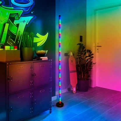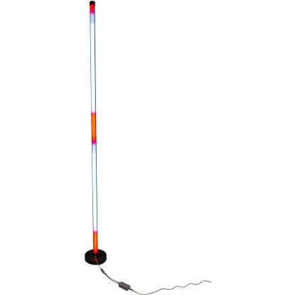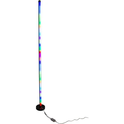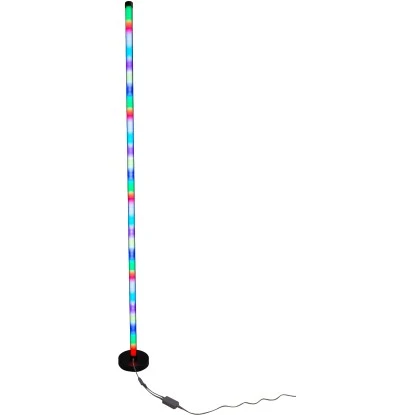 Geradlinig und minimalistisch im Design präsentiert sich die attraktive LED-Digital-Deko-Stehlampe Motion Light. Die dimmbare Stehlampe mit einer Höhe von 150 cm passt hervorragend in das modern eingerichtete Wohn- oder Esszimmer. Durch ihre Gestaltung mit den Materialien Aluminium, ABS und Silikon in der Farbe schwarz, passt sich das Beleuchtungselement sehr gut in des bereits vorhandene Interieur des Wohnraums ein. Neben einer Wohnlandschaft oder einem Lowboard platziert, kommt die Leuchte sehr gut zur Geltung. Mit der in der Stehlampe integrierten RGB-Technik sind etwa 150 verschiedene Funktionen und Farbeinstellungen möglich. Die Lichteffekte sind individuell mit einer Fernbedienung steuerbar.