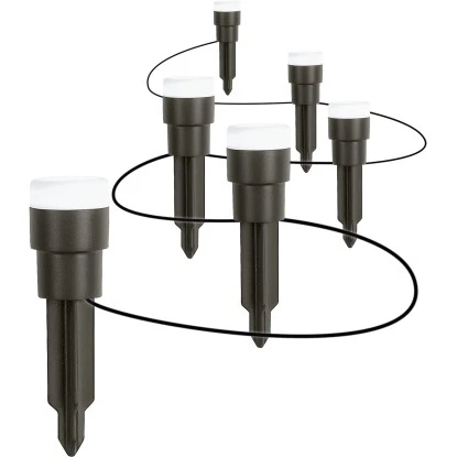 Die elegant schicke Osram LED-Gartenleuchte Dot eignet sich hervorragend um Akzente im Garten oder auf der Terrasse zu setzten. Ebenso lassen sich Wege auf dekorative Art ausleuchten, sodass ein im Dunkeln tappen der Vergangenheit angehört. Sie strahlen ein angenehmes warmweißes Licht aus. Verbunden sind die 6 Leuchten jeweils über ein 0,5 m langes Kabel, während die Verbindung zwischen der ersten Leuchte und dem Steckernetzteil ein 5 m langes Kabel ist. Jede einzelne Leuchte verfügt über einen Erdspieß, wodurch die Montage mühelos erfolgen kann und ein sicherer Halt gewährleistet ist. Die IP Schutzart der Leuchten beträgt IP66 und die Schutzart des Netzteils IP44.