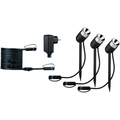 Die Spotlights bieten ein flexibles und dekoratives Lichtelement und verleihen Ihrem Außenbereich eine stimmungsvolle Beleuchtung. Die Strahler lassen sich individuell einstellen, sodass der Lichtkegel genau dort hinfällt, wo Sie diesen haben möchten. Die LED-Spieße können mit allen Leuchten aus dem Paulmann Plug & Shine System kombiniert werden und ermöglichen so eine individuell gestaltete Beleuchtung Ihres Gartens. In diesem Set sind 5 m Verbindungskabel mit vier Ausgängen und ein Trafo für den Betrieb der Leuchten enthalten.