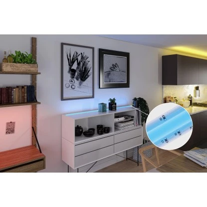 Mit der stimmungsvollen Farbwechselfunktion kann man ein individuelles Wohnambiente schaffen, von einfarbiger Dauerbeleuchtung bis hin zu mehrfarbigen Lichteffekten ist alles möglich. Mit einem breiten Ausstrahlungswinkel von 180° wird das Licht optimal verteilt, ohne Schattenbildung. Der Strip ist mit einer durchgängigen Phosphorschicht versehen, die vor Staub und Feuchtigkeit schützt und somit eine lange Lebensdauer gewährleistet.