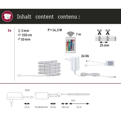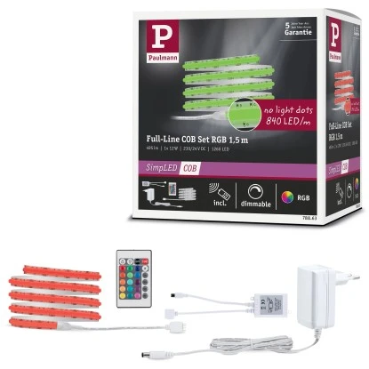 Das Paulmann SimpLED LED Strip COB Komplettset in mehrfarbiger Ausführung mit einer Länge von 1,5 Metern und einer Leistung von 12 Watt ist direkt einsatzbereit. Das Set beinhaltet den Strip selbst sowie einen Netzstecker. Der Strip eignet sich perfekt als Stimmungslicht, Orientierungslicht oder zur indirekten Raumbeleuchtung und kann vielseitig eingesetzt werden. Er erzeugt ein homogenes Lichtbild ohne sichtbare Lichtpunkte, dank der COB-Technologie.