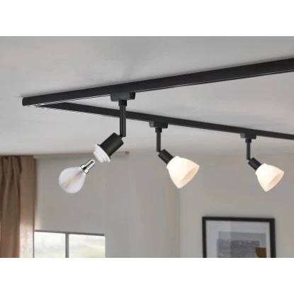 Die schwarze URail Schienenleuchte -DecoSystems- bietet volle Flexibilität bei der Auswahl des Lampenschirms und des Leuchtmittels. Sie kann mit einem beliebigen DecoSystems-Schirm ausgestattet und einem E14-Leuchtmittel bestückt werden.
