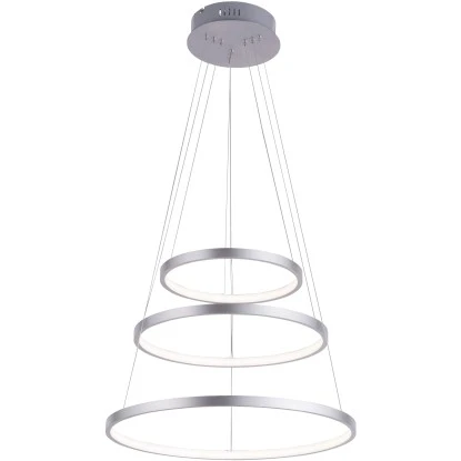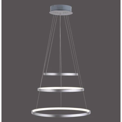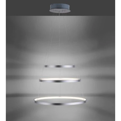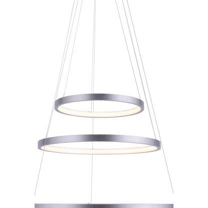 Die kreisrunde, stahlfarbige LED Pendelleuchte überzeugt mit ihrem modernen Design. Sie wird inklusive einem festverbauten 24,5 Watt LED-Leuchtmittel im oberen Ring, einem festverbauten 19,5 Watt LED-Leuchtmittel im mittleren Ring und mit einem festverbauten 13,5 Watt LED-Leuchtmittel im unteren Ring geliefert und kreiert mit ihrer warmweißen Lichtfarbe von 3000 Kelvin eine gemütliche Wohlfühlatmosphäre.