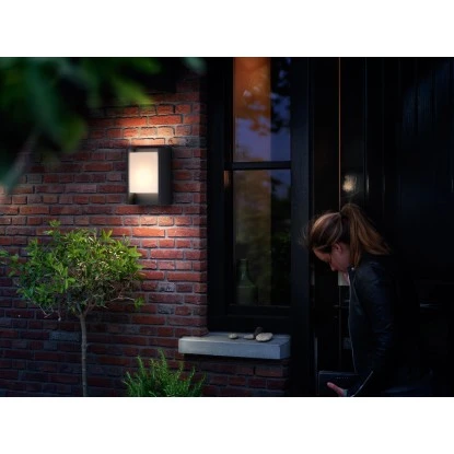 Die Philips LED-Wandleuchte Arbour für den Außenbereich umrahmt das Leuchtelement mit einem widerstandsfähigen Gehäuse aus Aluminiumguss in Anthrazit. Diese ansprechende Leuchte versorgt Ihren Außenbereich mit ausreichend gestreutem, warmweißem Licht.