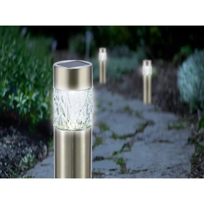 Für die Beleuchtung in Ihrem Außenbereich sorgt eine fest verbaute LED. Neben einer hohen Lebensdauer punktet sie mit einem niedrigen Energieverbrauch sowie geringen Wärmeentwicklung. Dank der Lichtfarbe in Tageslichtweiß schafft der Solarspieß eine angenehme Lichtatmosphäre. Mit der IP-Schutzart 44 ist er vor Spritzwasser geschützt. Zur Fixierung in der Erde verfügt die Spießleuchte über einen Erdspieß. Nach Ihrem persönlichen Geschmack können Sie den Solarspieß im Blumenbeet, auf dem Rasen oder in Pflanzkübeln platzieren. Ebenso eignet er sich als schicke Wegbegrenzung. Im Lieferumfang sind drei Stück enthalten.